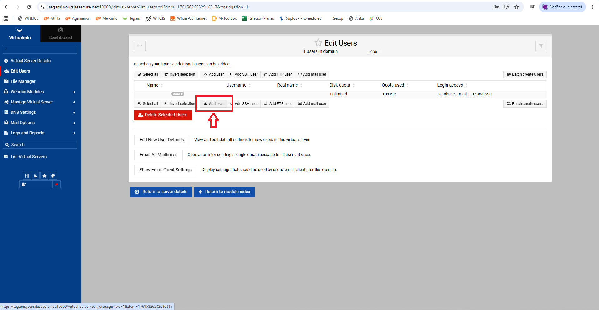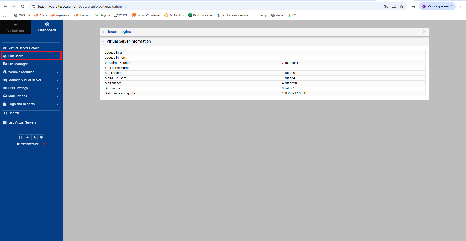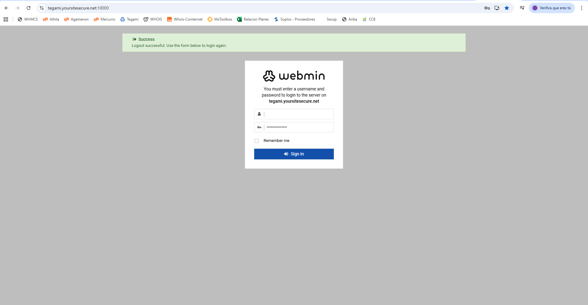 1. Ingresar al URL https://tegami.yoursitesecure.net:10000/ con los datos de administrador