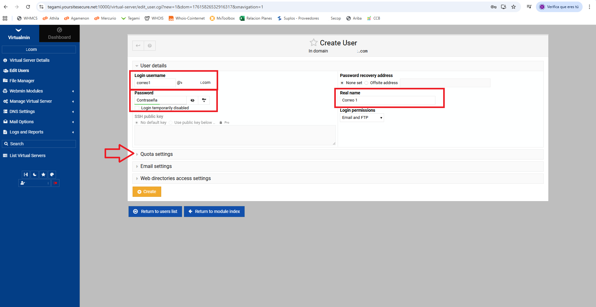 4. Diligenciar “Login username” o nombre de correo, “Password” o contraseña (esta se puede generar de manera aleatoria dando click en el icono de la llave o escribir a gusto propio) y “Real Name” o nombre que tendrá la cuenta (puede ser el nombre del trabajor, área o mismo nombre del correo antes del @). Posteriormente, dar click en “Quota settings” para asignar la capacidad del correo