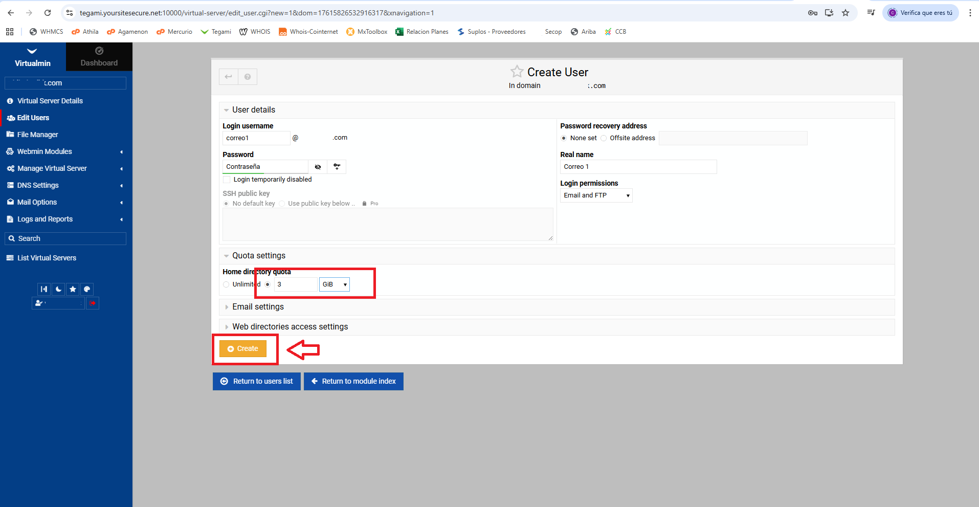 5. De acuerdo al plan adquirido se asigna la capacidad, sino no funcionara el correo, en este caso se coloca 3 y se cambia “Mb” (esta por defecto) a “Gb”. Posteriormente se da click en “Create” y la cuenta queda creada.